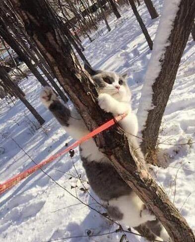 紧接着,戏剧性的一幕来了!猫咪“嗖”地一下,蹿上了旁边一棵大树,动作快得像练过轻功。铲屎官傻眼了,拽着绳子喊它下来,可这家伙死活不听,两只小爪子紧紧抱住树干,活像在抱救命稻草。铲屎官使劲拉,猫咪愣是不松手,眼神里满是“救命”的信号。