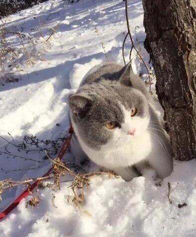 那天,外面刚下完雪,地上白茫茫一片,阳光洒下来,暖洋洋的。铲屎官看天气不错,决定带自家猫咪出去溜达。这只英短蓝白猫,脸圆身圆,毛色光滑,走起路来小肚子一晃一晃,可爱得让人想捏一把。铲屎官牵着绳子,猫咪在雪地里迈着小碎步,活像个小皇帝巡街。