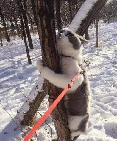 不过,这猫咪的反应也挺正常。想想看,雪地里冷不丁冒出一只大狗,体型比自己大好几倍,换谁不慌?猫咪爬树,其实是本能反应。树对猫来说,就像咱们遇到危险时想找个安全屋。爬得越高,它就觉得越安全。这小家伙虽然怂,但脑子转得快,知道第一时间“跑路”。